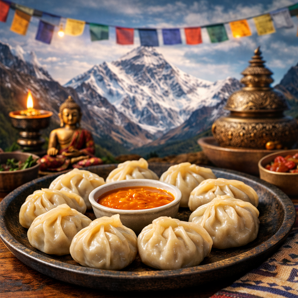 ネパールのモ-モ-が円形にきれいに並べられ、中央にはピリ辛のオレンジ色のアチャール(ソース)が置かれています